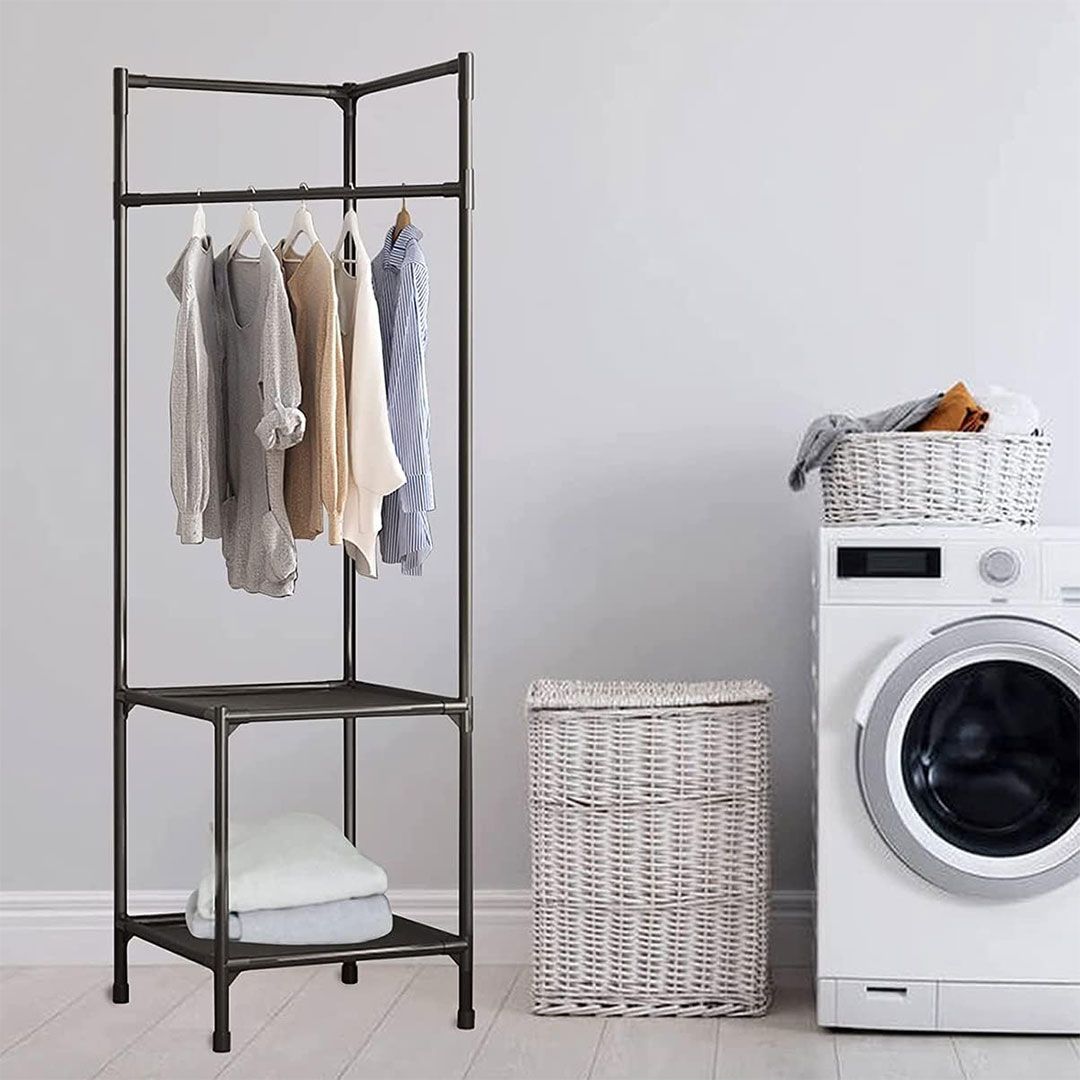 الملابس تتكدس، الأحذية تضيع، والمساحة الصغيرة تزيد المشكلة… هذا المنظّم يستغل الزاوية بذكاء ويجمع كل شي بمكان واحد.